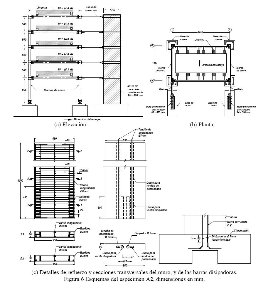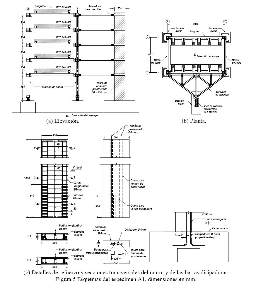 El sistema estructural del espécimen A1 fue del mismo tipo que el comentado para el espécimen E1, con la variante de que tenía un muro autocentrado diseñado para tener una participación del 30% del momento de volteo total de diseño La sección del muro era 0.35x0.09m, con una altura de 3000 mm, Fig 5. El sistema de unión en cada nivel, entre los marcos y muro, fue el mismo anteriormente descrito para el espécimen E1. Además, el muro tenía dos tendones de postensado de 6mm de diámetro y dos barras disipadoras de 6mm de diámetro, construidas empleando dos barras corrugadas convencionales, producidas en México, de 9.5mm de diámetro. Estas barras se maquinaron en una longitud de 65mm para generar el disipador tipo dog-bone de superficie lisa, Fig 5. La fuerza de postensado aplicada en cada tendón estuvo asociada al valor 0.45 fpu El peso total del espécimen fue igual a 67.9 kN. El tipo de acero de refuerzo longitudinal para el muro de este espécimen fue el mismo comentado para el espécimen E1, con las propiedades mecánicas mostradas en la tabla 1. En la fig. 5 se presentan los esquemas de elevación y planta del espécimen, así como la sección transversal del muro, con indicación de los pesos en cada piso.