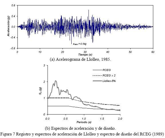 Para los ensayes en mesa vibradora se empleó el acelerograma registrado en la estación Llolleo, componente EO, el 3 de marzo de 1985 en Chile, por ser un acelerograma de un sismo intenso, dominante en períodos cortos y que inducía un comportamiento inelástico importante en los especímenes de ensaye. Además, el espectro elástico del registro sin escalar es comparable en algunas zonas del espectro con el espectro de diseño de la zona de Acapulco (zona D) y tipo de terreno I, especificado por el Reglamento de Construcciones para los Municipios del Estado de Guerrero (RCEG,1989), multiplicado por un factor de sobrerresistencia igual a 2, valor que toma en cuenta la sobrerresistencia implícita en una estructura diseñada de acuerdo con normativas en México. La sobrerresistencia se define como el cociente entre la resistencia de la estructura y la calculada con procedimientos convencionales elásticos empleando los requisitos de diseño correspondientes de la normativa que se emplee. El registro no fue escalado porque los especímenes no fueron diseñados a escala y no se emplearon leyes de similitud. La fig. 7a muestra el registro sísmico de Llolleo, cuya aceleración máxima es 0.64g. La fig. 7b muestra el espectro elástico de aceleración del registro usado, para una fracción de amortiguamiento crítico igual a 5%, así como el espectro elástico de diseño del RCEG (1989), multiplicado por el valor de la sobrerresistencia. Para el intervalo de periodos de interés, se consideró apropiado el uso del registro de Llolleo ya que para los periodos fundamentales de los especímenes, que son del orden de 0.25s y 0.40s, implicarían considerar una sobrerresistencia del orden de 2.7 a 3, lo cual está dentro del intervalo de 2 a 3 que se menciona en la literatura (Uang, 1991; Rodríguez y Restrepo, 2012).