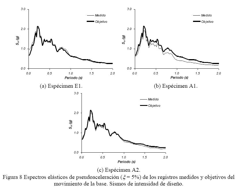 El registro original para el espécimen E1 fue filtrado con un filtro pasa-banda de 0.2 y 30 Hz que, sumado a factores de ruido en el funcionamiento de la mesa vibradora, produjo aceleraciones máximas mayores que los del registro objetivo, del orden de 0.93g (Sánchez, 2008); éste fue el único movimiento de alta intensidad aplicado al espécimen. Para el espécimen A1, el registro original fue filtrado con un filtro pasa-banda de 0.2 y 15 Hz, que produjo aceleraciones máximas reales menores en el registro medido, del orden de 0.61g. Para el espécimen A2, el registro original fue filtrado con un filtro pasa-banda de 0.5 y 30 Hz que, sumado a factores relativos a la operación de la mesa vibradora, produjo una mayor duración del movimiento en esta fase y aceleraciones ligeramente mayores a las del registro medido, del orden de 0.71g. La fig. 8 muestra los espectros elásticos de pseudoaceleraciones, Sa, de los registros medidos y objetivos, calculados considerando una fracción de amortiguamiento crítico igual a 5%.