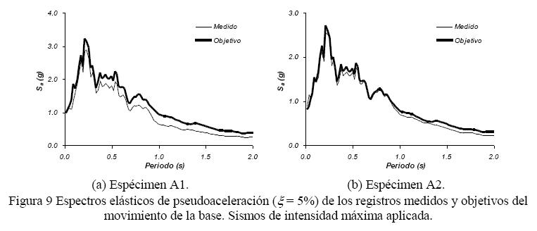 Para el espécimen A1, el movimiento en la base empleado para el espécimen A1 fue el registro de aceleraciones de Llolleo escalado por un factor de 1.50, con una aceleración máxima objetivo de 0.98g. Como en el caso anterior, el registro original fue filtrado con un filtro pasa-banda de 0.2 y 15 Hz, que produjo en el registro medido una aceleración máxima del orden de 1.00g. Para el espécimen A2, el movimiento en la base empleado fue el registro de aceleraciones de Llolleo escalado por un factor de 1.25, con una aceleración máxima de 0.81g; el registro original fue filtrado con un filtro pasa-banda de 0.5 y 30 Hz que, sumado a factores de ruido en el funcionamiento de la mesa vibradora, produjo en el registro medido en la mesa aceleraciones ligeramente mayores que las del registro objetivo, con una aceleración máxima de 0.89g. La fig. 9 permite comparar los espectros elásticos de pseudoaceleraciones de los registros medidos y objetivos en esta etapa de ensaye, calculados considerando una fracción de amortiguamiento crítico igual a 5%, valor comúnmente empleado para definir espectros de diseño en diferentes normativas de construcción.