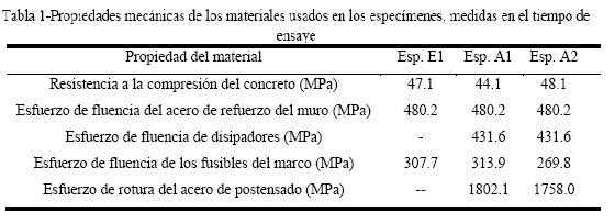 Para el diseño de los muros se empleó un concreto con resistencia especificada a la compresión, fc' , igual a 34.3 MPa y un esfuerzo especificado de fluencia, fy , igual a 412 MPa para el acero de refuerzo del muro y las barras disipadoras, el cual fue del tipo ASTM A615. Los fusibles del marco se diseñaron con acero tipo A-36. Los tendones de postensado se consideraron de acero con una resistencia última especificada, fpu , igual a 1670 MPa.