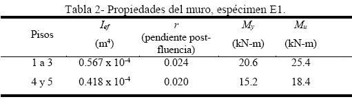 La tabla 2 presenta las propiedades del muro del espécimen E1 en las dos secciones típicas que se definieron considerando el cambio del acero de refuerzo longitudinal en elevación del muro (fig. 4), tales como la inercia efectiva de la sección en el tramo inicial, Ief el factor de la pendiente post-fluencia, r, el momento de fluencia, My, y el momento último, Mu.