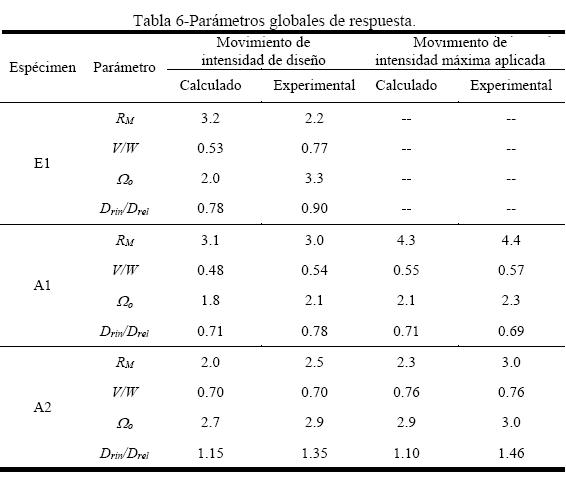 Se calcularon algunos parámetros globales de la respuesta de los modelos analíticos y de los especimenes E1, A1 y A2, con los resultados de los movimientos de baja intensidad y de alta intensidad, que se presentan en la tabla 6. Los parámetros globales presentados en la tabla 6 son el cociente RM , la relación entre el cortante máximo en la base y el peso total del edificio, V/W, la sobrerresistencia Ω0, y la relación entre los desplazamientos máximos en el piso superior considerando una respuesta inelástica y aquél obtenido conservando una respuesta elástica, Drin / Drel. El cortante máximo en la base, V, fue calculado como el máximo valor de la historia de cortantes basales, valuados como la suma de las fuerzas inerciales de cada piso, que son iguales a su vez al producto de la masa por la aceleración absoluta horizontal de cada piso.
