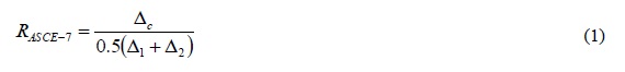 El índice de flexibilidad más conocido es el propuesto en reglamentos y recomendaciones de diseño de los Estados Unidos, como por ejemplo el UBC-97 (1997), ASCE-7 (2010) y FEMA-368 (2001), donde se define a un diafragma como flexible, para fines de la distribución de fuerzas cortantes y momentos torsionantes de piso, cuando el desplazamiento lateral máximo del diafragma excede dos veces el desplazamiento lateral promedio de entrepiso, calculándose este último a partir de promediar los desplazamientos laterales obtenidos en los elementos verticales resistentes adyacentes (por ejemplo, marcos y/o muros), como se ilustra en la figura 20 y se indica en la ecuación 1, donde Δ1 y Δ2 son los desplazamientos de los marcos del perímetro y Δc es el desplazamiento máximo del diafragma. En caso contrario, el diafragma debe considerarse como rígido para fines prácticos.