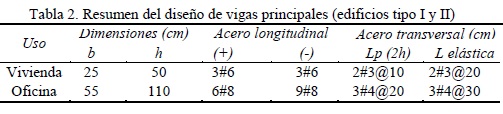Los detalles del diseño de vigas y columnas conforme al Reglamento de Construcciones del Distrito Federal (RCDF-04 2004) y sus Normas Técnicas Complementarias correspondientes (NTCC-04 2004) se presentan en Chinchilla (2012). Del proceso de diseño se obtuvo que, para fines prácticos, las dimensiones y los refuerzos de las secciones transversales para los edificios tipo I y II pudieran ser las mismas, por lo que los diseños de las vigas y columnas se resumen en las tablas 2 y 3 respectivamente. La notable diferencia entre las secciones obtenidas para edificios de vivienda y oficina se debe principalmente a la dificultad de cumplir estados límites de deformación y de resistencia para los grandes claros de los edificios de oficina y a que las cargas vivas y muertas en oficinas son mayores.