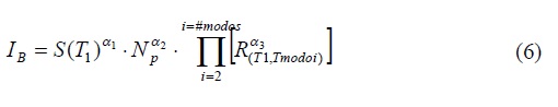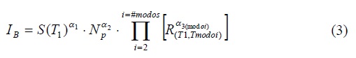 La ecuación 3 muestra que el parámetro IB incorpora tanto la predicción del comportamiento no lineal como el efecto de los modos superiores. Note que INp es un caso particular de IB cuando se utiliza el espectro de pseudo-aceleración como parámetro espectral y α3(modoi) es igual a cero para todos los modos. Además, en esta expresión los exponentes α1 α2 y α3 son parámetros que deben ser calibrados. Es importante mencionar que el exponente α3(modoi) asociado a un modo de vibrar puede variar para cada modo, por simplicidad en la ecuación 3 se supone igual para todos los modos y se puede reescribir de la siguiente manera: