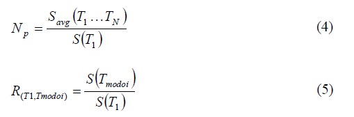 En la ecuación 3, IB representa la intensidad de Bojórquez; S(T1) representa un parámetro espectral tomado de cualquiera de los espectros de pseudo-aceleración, velocidad y/o desplazamiento; Np de la ecuación 1 por conveniencia lo podemos reescribir como se indica en la ecuación 4; RT1,Tmodoi se define como el cociente de un parámetro espectral en el periodo del i-ésimo modo de vibrar de la estructura (S(Tmodoi)) y un parámetro espectral en el periodo fundamental de vibración (S(T1)), siendo T1 mayor que Tmodoi (ver ecuación 5).