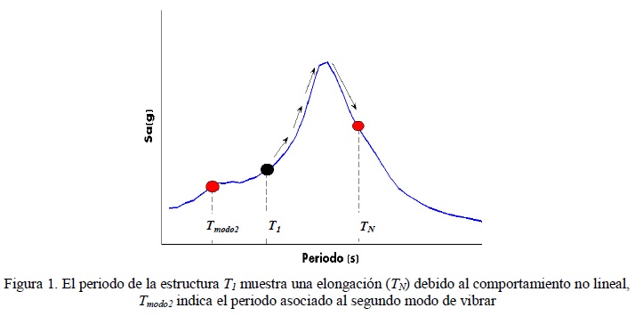 A menudo las medidas de intensidad sísmica tratan de capturar la respuesta estructural a través de la forma espectral y cada una de ellas lo logra con diferente nivel de exactitud. Por ejemplo, Sα(T1) predice con excelente aproximación la respuesta de sistemas elásticos de un grado de libertad o la respuesta de sistemas elásticos de múltiples grados de libertad dominados por el primer modo de vibrar T1. Sin embargo, las estructuras presentan comportamiento no lineal cuando se someten a movimientos sísmicos intensos, y, en estos casos, sufrirán una elongación en su periodo de vibración, debido a que durante el movimiento cambiaran sus características dinámicas. Por lo tanto, el periodo efectivo de vibración será diferente al periodo fundamental elástico T1, lo que implica que deben tomarse en cuenta las ordenadas espectrales para periodos mayores que T1 como se ilustra en la figura 1.