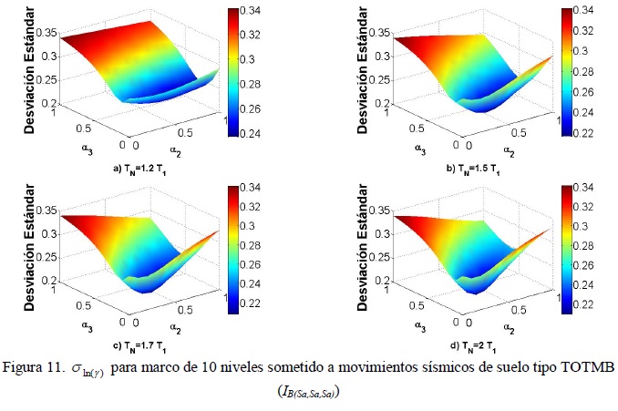 Es importante mencionar que para todas las figuras cuando α2 y α3 son iguales a cero se obtiene Sα(T1). Para este caso, se observa que σln(γ) es mucho mayor para Sα(T1) que cuando α2 y α3 son diferentes de cero. Por lo tanto, se puede concluir que las medidas de intensidad sísmica INp e IB(Sα,Sα,Sα), están más relacionadas con la respuesta estructural. Además, note que debido a los que los parámetros Np y RT1,T2 son adimensionales, la intensidad IB tendrá las unidades del parámetro utilizado, donde en la ecuación 8 corresponde a las unidades de pseudo-aceleración, esto es gracias a que α1 es igual a la unidad.