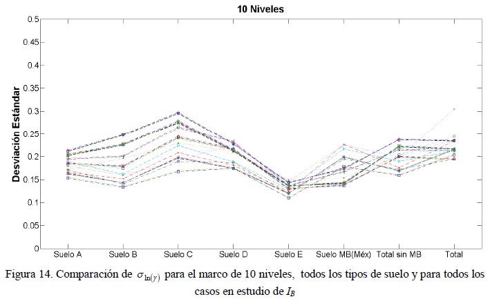 Las figuras 8-13 (9, 10, 11, 12) muestran algunos resultados obtenidos para la mayoría de los registros sísmicos seleccionados, así como de dos clasificaciones adicionales donde se calculó la desviación estándar para todos los tipos de suelo en forma simultánea, esta clasificación se le llama TOTAL, pero se hizo sin involucrar el tipo de suelo MB. Después, se calcula la desviación estándar de todos los tipos pero ahora incluyendo el suelo MB, llamado TOTMB. Esto se da un total de 6 tipos de suelos, 2 tipos combinados para 6 marcos estructurales diferentes. Dichos resultados se obtuvieron con la finalidad de encontrar los valores de α1 α2 y α3 que presentan las menores desviaciones estándar, y por lo tanto que reducen la incertidumbre asociada en la predicción de la respuesta estructural de edificaciones sometidas a sismos de diversas características.