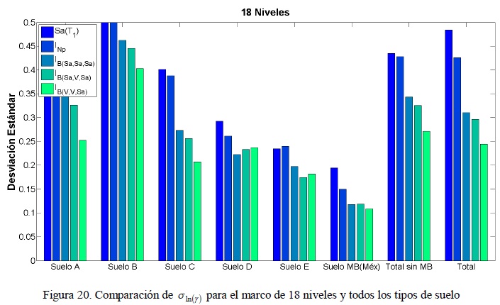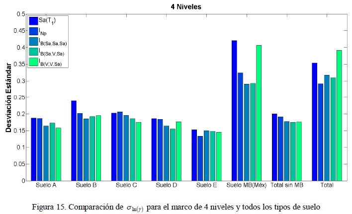 Al analizar los tres casos de IB se puede concluir que IB(Sα,Sα,Sα) y IB(Sα,V,Sα) presentan una desviación estándar similar para la mayoría de los tipos de suelo y estructuras, mientras que para IB(V,V,Sα) la desviación estándar tiende a disminuir para algunos tipos de suelos a medida que se incrementa la altura de la estructura con respecto a IB(Sα,Sα,Sα) y IB(Sα,V,Sα). Como muestran los resultados, los tres casos de IB presentan una eficiencia similar por tal motivo se recomienda utilizar IB(Sα,Sα,Sα) como medida de intensidad sísmica, ya que resulta más fácil su empleo en comparación con los otros dos casos ya que únicamente se necesita el espectro de pseudo-aceleración para estimarlo.