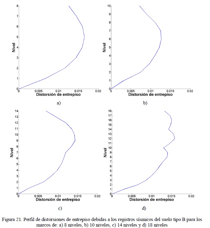Como se menciono anteriormente la medida de intensidad sísmica IB es capaz de considerar el efecto de los modos superiores de vibrar sobre sistemas estructurales; sin embargo, no se había presentado evidencia de que hubiera un efecto significativo por ejemplo del segundo modo en las estructuras utilizadas en este trabajo. Con la finalidad de demostrar el efecto del segundo modo de vibración o de modos superiores, se gráfica el perfil de distorsiones de entrepiso de algunas estructuras con la altura. La figura 21 muestra el perfil de distorsiones de entrepiso para los marcos de 8, 10, 14 y 18 niveles que son las edificaciones más altas para valores de distorsión máxima de entrepiso superiores a 0.012. Note que en estas edificaciones se espera mayor influencia de los modos superiores. En la figura se observa que para todos los marcos mostrados se presentan las distorsiones máximas de entrepiso en los niveles superiores, lo cual demuestra que estas edificaciones se ven influenciadas por modos superiores de vibrar en su respuesta sísmica.