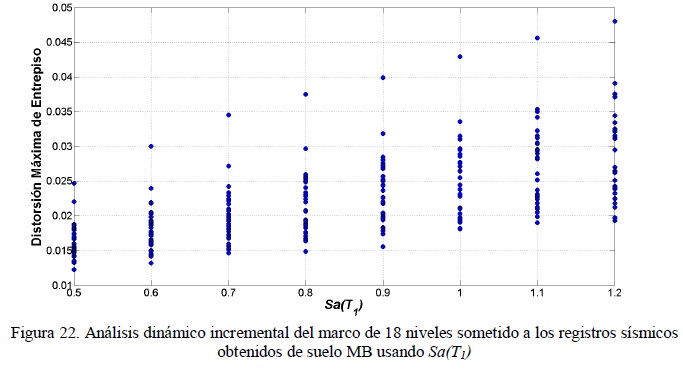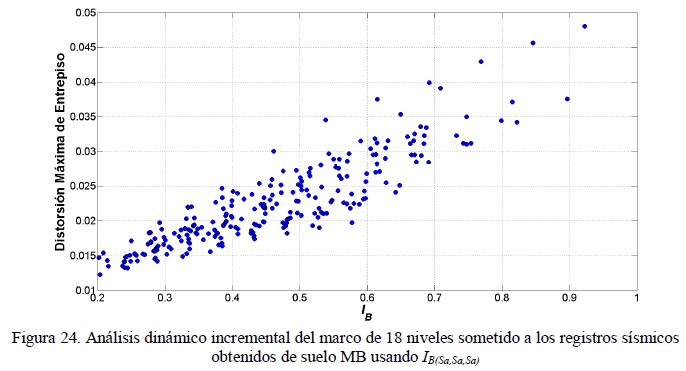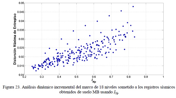 Para representar la dispersión de la demanda sísmica dada una medida de intensidad, se obtuvieron las figuras 22 a 24 (23) que representan análisis dinámico incremental en términos de Sα (figura 22) y que fueron adaptados para las otras medidas de IS (figuras 23-24). Las figuras muestran la dispersión de la distorsión máxima de entrepiso para cada parámetro considerado en este estudio y para el marco de 18 niveles ante movimientos de suelo MB característico de la ciudad de México. Para los casos de INp e IB estos fueron calculados con los valores de α y α1, α2 y α3 descritos anteriormente. Se observa que la dispersión de la demanda sísmica es mucho menor cuando se utiliza IB en comparación con los otros parámetros analizados, lo cual indica las ventajas de esta medida de intensidad sísmica con respecto a las otras. Se hace notar que la reducción de la incertidumbre en la respuesta sísmica es de gran utilidad para establecer criterios de selección de acelerogramas para análisis y diseño sísmico, así como para estudios de vulnerabilidad y confiabilidad estructural.