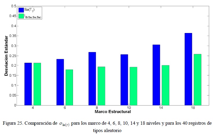 Con la finalidad de demostrar que los exponentes α1, α2 y α3 obtenidos en este estudio, para los cuales la medida IB presenta menores desviaciones estándar, no dependen de los registros previamente utilizados en este trabajo. Se seleccionaron 40 registros de manera aleatoria tomados de la base de datos del Centro de Investigación de Ingeniería Sísmica del Pacifico (Base de Datos NGA), con estos registros se obtuvieron las desviaciones estándar para el caso de IB(Sα,Sα,Sα) tomando en cuenta únicamente los exponentes α1, α2 y α3 iguales a 1, 0.4 y 0.2 respectivamente, para los 6 marcos estructurales en estudio. La figura 25 permite realizar una comparación justa entre IB(Sα,Sα,Sα) y Sα(T1), debido a que los registros aleatorios utilizados para obtener las desviaciones estándar de IB(Sα,Sα,Sα) no fueron utilizados previamente para definir α1, α2 y α3. En la figura 25 se observa que para la mayoría de los marcos estructurales IB(Sα,Sα,Sα) presenta menores desviaciones estándar que Sα(T1); sin embargo, para el marco de 4 niveles la desviación estándar es bastante similar para ambas medidas de intensidad sísmica esto debido a la baja altura del marco sobre el cual no se presenta un efecto considerable del segundo modo de vibración.