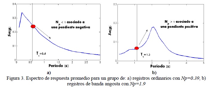 El término Np en la ecuación 1 se adoptó, debido a que representa la contribución de N puntos del espectro. Para entender mejor la información dada por Np, supongamos que tenemos uno o un número n de registros con un valor promedio de Np cercano a uno, esto indica que se espera que el espectro promedio sea plano en el intervalo de periodos comprendido entre T1 y TN. Para un valor de Np menor a la unidad el espectro promedio tendrá una pendiente negativa. Como ejemplo, el valor medio de Np para un grupo de registros en el intervalo de periodos T1=0.6s hasta TN=2T1 (ver figura 3a) es 0.39. En el caso de valores de Np mayores que la unidad, éstos estarán asociados a una zona de incremento en las ordenadas espectrales, y tendrán una pendiente positiva a partir de T1. En la figura 3b, se aprecia que el espectro promedio, para un conjunto de registros de banda angosta, con valor medio de Np=1.9 en un intervalo de periodos T1=1.2s a TN=2T1, muestra un incremento en sus aceleraciones espectrales.