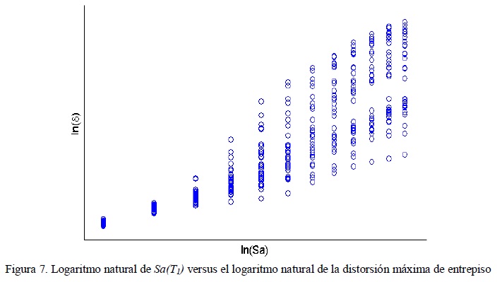 Posteriormente se calcula el logaritmo natural de la distorsión máxima de entrepiso y también el logaritmo natural de la medida de intensidad utilizada. La figura 7 muestra los resultados para el caso de Sα(T1). En el siguiente paso se realiza un análisis de regresión lineal para todos los niveles de escalamiento, primeramente para Sα(T1) y además se obtiene la desviación estándar del logaritmo natural de la distorsión máxima de entrepiso (σln(γ)). Para estimar σln(γ) usando INp así como todos los casos particulares en estudio de IB, se realiza el análisis de regresión considerando en el eje horizontal el logaritmo natural de ambos parámetros.