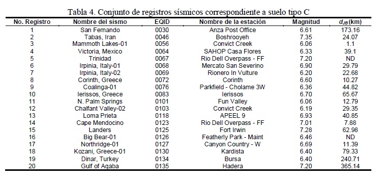 Para simular el comportamiento de las estructuras en suelos muy blandos característicos de la Ciudad de México (Suelo MB) o sismos de banda angosta, se utilizaron los registros sísmicos listados en la tabla 7. Los movimientos de banda angosta se caracterizan por afectar considerablemente estructuras que tienen periodos de vibración dentro de cierto intervalo, especialmente aquellas que sufren del efecto de ablandamiento. De hecho, estos registros demandan una gran cantidad de energía en las estructuras en comparación con los movimientos de banda ancha (Terán-Gilmore y Jirsa, 2007).