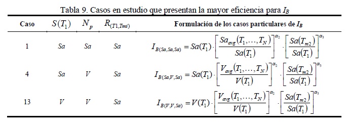 Para generar los casos particulares en estudio de IB se tomaron en cuenta tres parámetros espectrales, los cuales son obtenidos a partir de los espectros de pseudo-aceleración Sα, velocidad V y desplazamiento D, aunque pueden ser utilizados otros parámetros. En algunos casos se utilizó un solo parámetro espectral para definir IB (ver Caso 1, tabla 8), mientras que en otros casos se combinaron dos o tres de estos parámetros espectrales de tal manera que la medida de intensidad sísmica funcionaría como híbrida. En la tabla 8 se muestran los 30 casos particulares en estudio de IB.