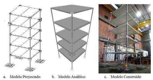El diseño y análisis estructural del modelo se llevó a cabo mediante el empleo del programa de cómputo SAP2000(tm) (Computers and Structures Inc., 2012). El esquema de la modelación realizada se puede observar en la Figura 1, y en la Tabla 2 se muestran los períodos y las frecuencias de vibración obtenidos del análisis modal teórico. El modelo numérico se ajustó a las condiciones reales de construcción (secciones utilizadas, conexiones, pesos de los elementos, etc.) con el fin de que representara más apropiadamente las condiciones reales del modelo construido y así obtener una adecuada correlación entre los resultados teóricos y experimentales.
