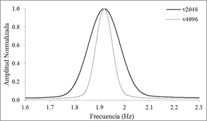 La Figura 10 muestra el espectro de potencia de la señal de la azotea, normalizado para el primer modo y calculado para dos longitudes de ventanas promediadas (2048 y 4096 puntos). Cabe resaltar como el ancho de banda disminuye a medida que se aumenta la longitud de las ventanas, por lo que se obtendrían valores diferentes de fracciones de amortiguamiento crítico si se empleara únicamente el método del ancho de banda de Kawasumi y Shima (1965). Por este motivo se aplica la corrección descrita por Boroschek y Hernandez (2010) para estimar un valor de la fracción de amortiguamiento crítico confiable.