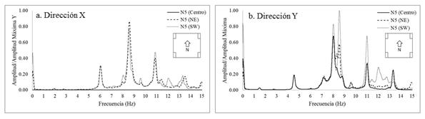 Figura 5 Espectros de potencia obtenidos a partir de los registros de los sensores ubicados en la base y en el nivel N5 (azotea) para las pruebas de vibración ambiental en translación