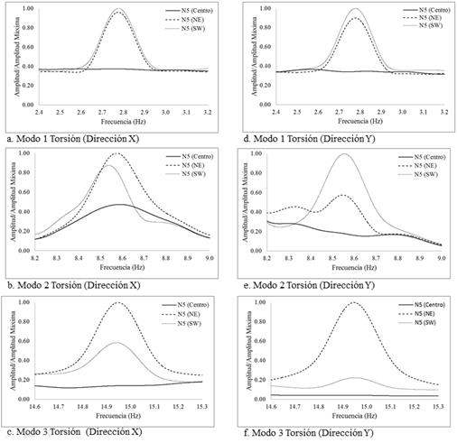Para el análisis de estas propiedades se hace igualmente uso de los cocientes espectrales, pero en este caso entre las señales de los sensores de los extremos con el del centro de un mismo nivel. Estos describen picos en los puntos asociados a las frecuencias de torsión.