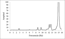 Para el modelo estructural, con base en este análisis se identificaron las frecuencias de vibración de torsión en 2.7, 8.5 y 14.9 Hz.