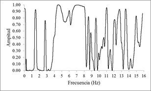 La función de coherencia por su parte, presenta valores altos, es decir cercanos a uno, para las frecuencias de la estructura (Figura 8). Si bien la coherencia es alta en los puntos de interés, también lo es para otros rangos diferentes, por lo que esta información por sí sola no es suficiente para el análisis de las propiedades de la estructura. Sin embargo, las funciones de coherencia entre los registros de los sensores ubicados en los puntos intermedios de la estructura, permiten realizar una verificación de los resultados calculados y de esta manera confirmar los valores de frecuencias modales identificadas mediante los espectros de potencia y cocientes espectrales en las comparaciones descritas.
