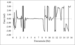 Adicionalmente, como mecanismo de comprobación, es posible observar el espectro de fase entre las señales de los espectros de los extremos de un mismo nivel. Para las frecuencias identificadas como de torsión las señales deben estar en desfase, esto es, mostrar un valor de ±π (Figura 19).