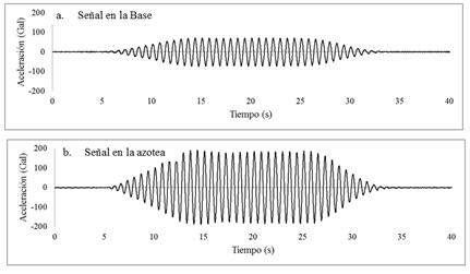 La Figura 16 muestra los registros obtenidos en la base y la azotea en las pruebas de vibración forzada. Cabe resaltar que la aceleración máxima en la base llega a 75 Gal, mientras que en la azotea alcanza casi 200 Gal.