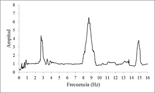 La Figura 18 muestra el cociente espectral descrito para uno de los niveles instrumentados. Se identifican las frecuencias de torsión de los tres primeros modos en 2.7, 8.7 y 14.8 Hz.