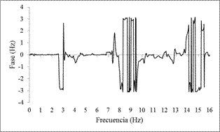 Figura 15 Espectro de ángulo de fase obtenido a partir de los registros de los sensores ubicados en los extremos opuestos del modelo para las pruebas de vibración ambiental en torsión