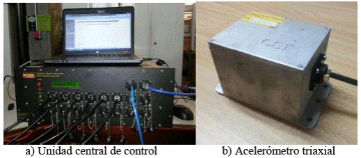 Para el registro de las señales de los experimentos se utilizaron acelerómetros triaxiales de fabricación neozelandesa denominados CUSP-Me y desarrollados por Canterbury Seismic Instruments. El equipo está compuesto por una unidad central de 16 canales a la cual se conectan acelerómetros de alta precisión. La Figura 2 muestra los aparatos utilizados en la medición.