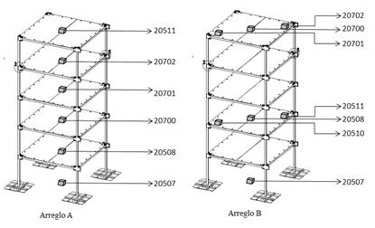 Para la identificación de las pruebas de traslación, con el arreglo A (Figura 3), se dispusieron sensores en cada uno de los niveles ubicados el mismo eje vertical. El sensor de la base registra la señal de entrada y se puede evaluar la respuesta en cada nivel de la estructura. Con este arreglo de instrumentos es posible identificar frecuencias de traslación, formas modales y amortiguamiento de la estructura.