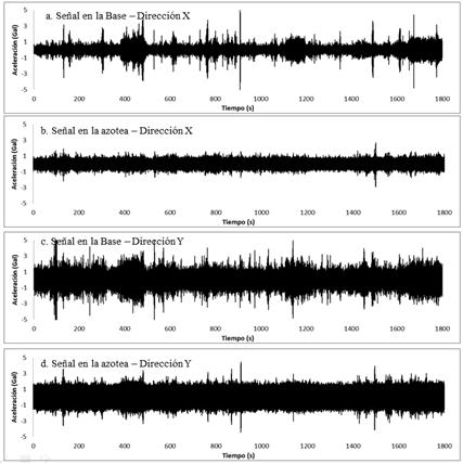La Figura 4 muestra los registros típicos de vibración ambiental obtenidos en la base y en la azotea del modelo estructural, para las dos direcciones de análisis.