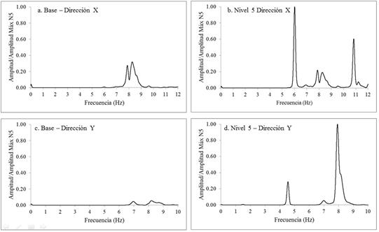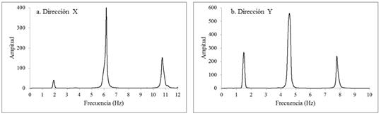 La Figura 6 muestra el cociente espectral entre los espectros de potencia de estas dos señales. Éste muestra picos asociados a las frecuencias del sistema en la dirección de análisis, y suprimen el contenido frecuencial del terreno. Estos picos están bien definidos y al compararlos con la información obtenida de los espectros independientes provee la información acerca de las frecuencias del sistema. Se identifican como las frecuencias de vibración de la estructura 1.9, 6.1 y 10.8 Hz para los tres primeros modos en la dirección X y 1.5, 4.6 y 7.9 Hz para los tres primeros modos en la dirección Y.