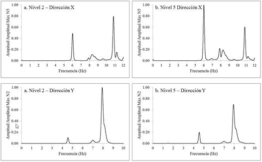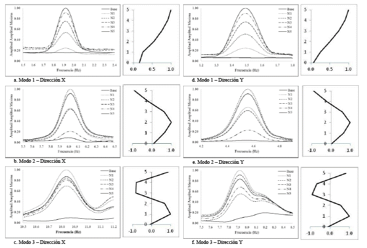 La Figura 9 ilustra los modos de vibración encontrados para las dos direcciones ortogonales de análisis. Para cada frecuencia identificada como un modo de vibración de la estructura, se normalizan con respecto al nivel con mayor y se leen los máximos de cada uno. Conjuntamente se identifica la fase entre pares de niveles; si los niveles se encuentran en fase (ángulo de fase igual a 0), las amplitudes ocurren con el mismo signo, si se encuentran en fase opuesta (ángulo de fase igual a±π), las amplitudes se escriben con signo contrario. De esta manera es posible construir las formas modales.