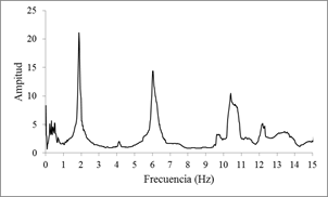 La Figura 17 muestra el cociente descrito, en la cual se pueden observar picos en 1.88, 6.02 y 10.55 Hz. Estos valores se identifican como las frecuencias de traslación de la estructura.