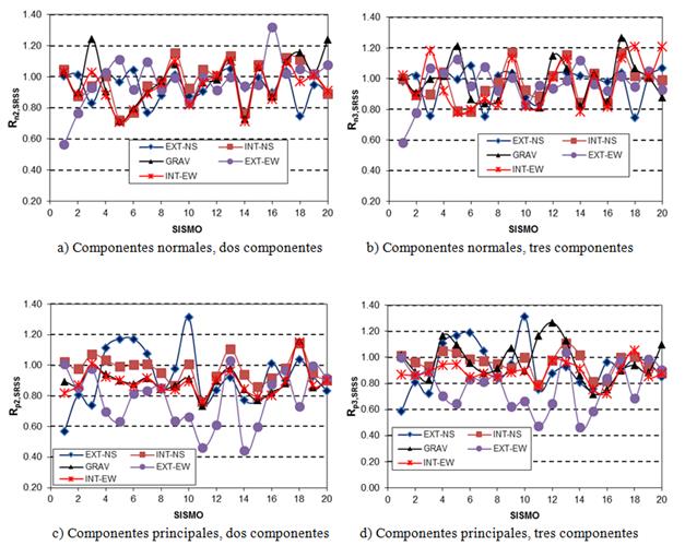 Para cualquier parámetro de respuesta colineal (carga axial) o no colineal (cortantes de entrepiso, cortante basal), la respuesta de referencia cuando los modelos se excitan por las dos componentes horizontales normales, denotada en lo sucesivo como Rn2, será la máxima respuesta de los Casos 1 y 2, mientras que para las componentes horizontales principales, la respuesta de referencia, Rp2, será la máxima respuesta de los Casos 3 y 4. Similarmente, cuando las estructuras se excitan por las tres componentes, la respuesta de referencia para componentes normales, denotada en lo sucesivo como Rn3, será la máxima respuesta de los Casos 5 y 6. La correspondiente respuesta de referencia para componentes principales, Rp3, será la máxima respuesta de los Casos 7 y 8.