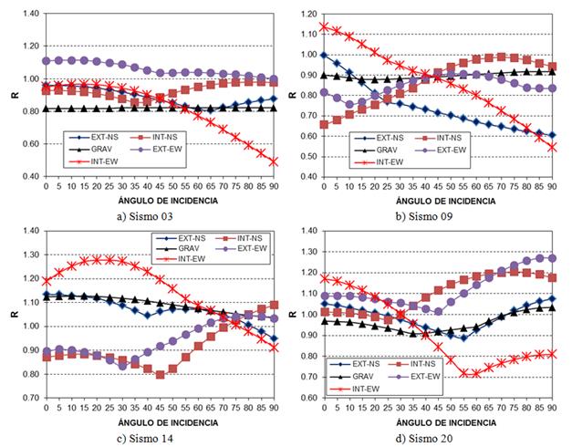 Otro de los objetivos principales de este trabajo es estudiar la orientación crítica de las componentes de los terremotos. Para ello, las componentes normales horizontales de los 20 registros sísmicos, cuyas características se describen en la Tabla 2, se rotan de 0 a 90 grados, con incrementos de 5 grados. Después, se introduce el parámetro R, que se define como la razón de la respuesta producida por las componentes normales (o rotadas a cierto ángulo de incidencia) y aquella producida por las componentes principales. Por lo tanto, valores de R mayores a 1.0 indican que la respuesta crítica se produce por las componentes normales o rotadas, por otra parte, valores menores a 1.0 indican que la respuesta crítica se produce por las componentes principales. Los valores de R se calculan para los Modelos 1 y 2, para comportamiento elástico e inelástico y para parámetros de respuesta colineales (carga axial) y no-colineales (cortantes de entrepiso y basal).