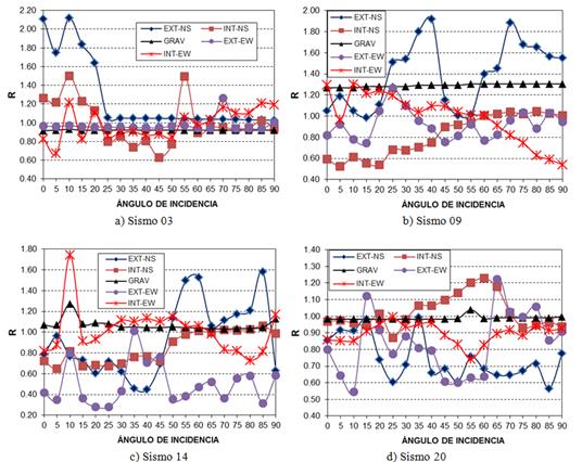 Como se comentó anteriormente, los 20 registros sísmicos se escalaron en términos de Sa(T1), y después para estudiar el efecto del comportamiento inelástico, estos se escalaron gradualmente para lograr fluencia significativa en los modelos. Los resultados del Modelo 1 para los sismos 03, 09, 14 y 20 se muestran en la Figura 7. Se observa que, al igual que para comportamiento elástico, el parámetro R varía de un sismo a otro, de un elemento a otro y de un ángulo de incidencia a otro sin mostrar ninguna tendencia. En este caso, la respuesta es mucho más sensible al ángulo de incidencia que para comportamiento elástico. Para las columnas de los marcos de gravedad, los valores de R son prácticamente los mismos para todos los ángulos de incidencia. El ángulo crítico es, en general, diferente para comportamiento elástico e inelástico. La observación más importante es que la respuesta crítica es mucho mayor a aquella producida por las componentes principales, se observan valores de R cercanos a 3 en algunos casos.