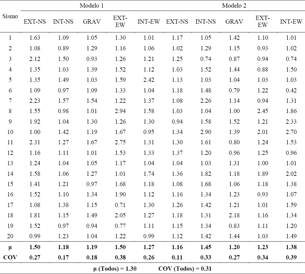 Las estadísticas para ambos modelos y reglas de combinación se presentan en la Tabla 7 para comportamiento elástico. Los resultados indican que, en promedio, ambas reglas subestiman la respuesta combinada alrededor de 15% y la incertidumbre asociada es alrededor de 15%. No se observan diferencias significativas entre ambas reglas de combinación ni entre componentes normales y principales. Los resultados para comportamiento inelástico siguen la misma tendencia, la única observación adicional es que los niveles de subestimación y de incertidumbre se incrementan ligeramente. Además, se puede observar que las estadísticas son prácticamente las mismas para dos y tres componentes, esto se debe a que la componente vertical no produce momentos significativos en las columnas y a que los valores de las ecuaciones (5) y (6) se definen principalmente por la magnitud de los momentos.