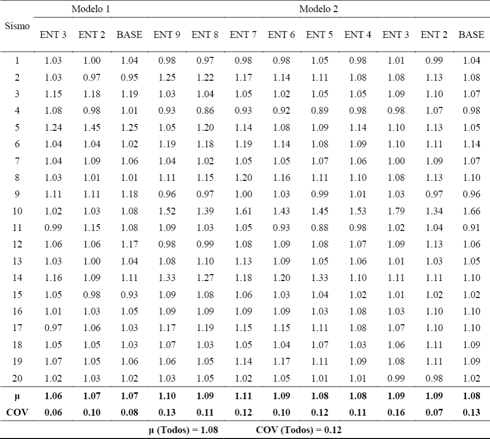 El parámetro R se estima siguiendo el mismo procedimiento que para el caso de carga axial, la única diferencia es que ahora representa razones de cortantes de entrepiso. Solo se presentan las estadísticas para comportamiento inelástico, estas se dan en la Tabla 12. En comparación al caso de carga axial, la variación de R de un terremoto a otro y de un entrepiso a otro es mucho menor. La media y el COV, considerando ambos modelos, todos los entrepisos y todos los terremotos, son 1.08 y 0.12, respectivamente. Esto indica que la respuesta crítica es muy cercana a la producida por las componentes principales. No se observan diferencias significativas en las estadísticas de R para comportamiento elástico e inelástico ni para dos y tres componentes. En resumen, el parámetro R varía considerablemente con el ángulo de incidencia de las componentes, y la respuesta crítica en términos de carga axial y cortante de entrepiso es mayor a la producida por las componentes principales, particularmente para comportamiento inelástico. Los valores de las medias de R y la incertidumbre en su estimación son mucho mayores para carga axial que para cortantes de entrepiso. El ángulo crítico es, en general, diferente para cada elemento considerado y para comportamiento elástico e inelástico. Se propone que la respuesta crítica se obtenga como 1.30 y 1.10 veces la respuesta producida por las componentes principales, para carga axial y cortantes de entrepiso, respectivamente.