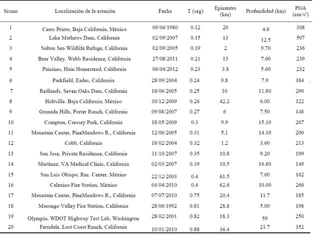 Las características de los registros sísmicos se muestran en la Tabla 2. Como se puede observar en la tabla, los periodos dominantes de los terremotos varían de 0.12 a 0.88 s. El periodo dominante para cada sismo se define como el periodo donde ocurre el valor máximo de la pseudo-aceleración en el espectro de respuesta elástico. Es importante mencionar que todos los registros seleccionados corresponden a suelo duro e intermedio. Los registros se obtuvieron de diferentes fuentes de información entre los que se mencionan el Conjunto de Datos del Programa Nacional de Movimientos Fuertes (NSMP por sus siglas en inglés) del Banco de Datos Geológicos de Estados Unidos (USGS por sus siglas en inglés). Se puede obtener información adicional acerca de estos sismos de dicha base de datos.