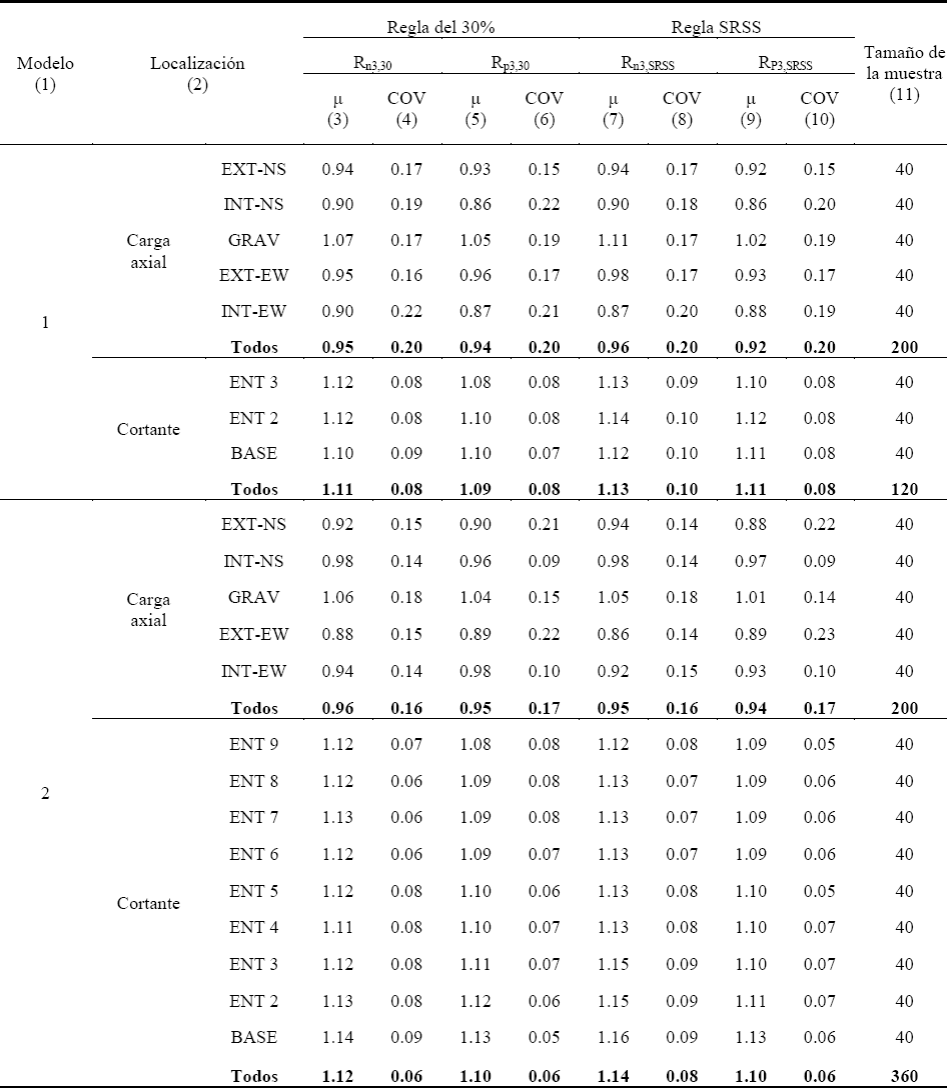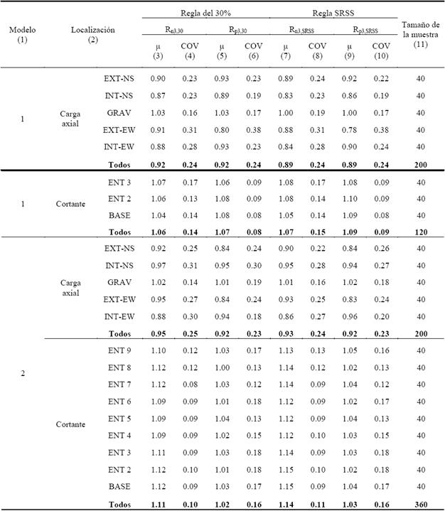 Tabla 3 Estadísticas para Rn2,30, Rp2,30, Rn2,SRSS y Rp2,SRSS, carga axial y cortantes de entrepiso, comportamiento elástico
