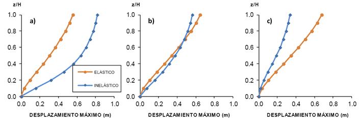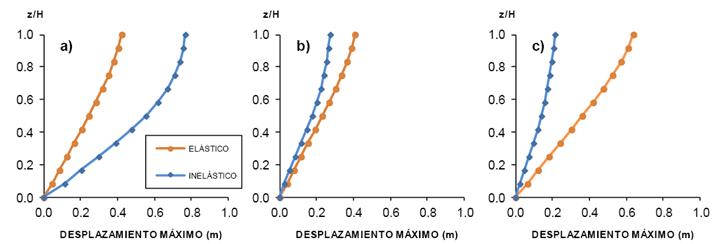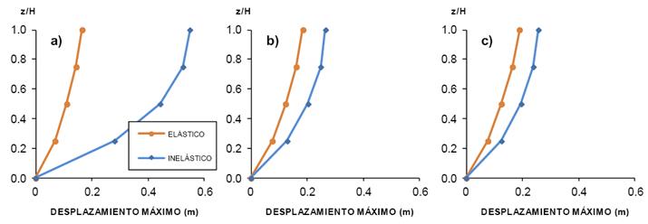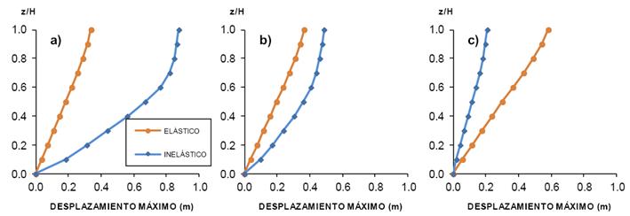 En los perfiles de desplazamientos mostrados en las figura 5, figura 6, figura 7 y figura 8 se puede observar que los desplazamientos inelásticos son mayores que los elásticos si la relación de periodos T/Tg es pequeña. Sin embargo, cuando la relación T/Tg crece, los desplazamientos inelásticos tienden a ser menores que los desplazamientos elásticos. Asimismo, se observa que la diferencia entre desplazamientos elásticos e inelásticos es grande cuando la relación T/Tg disminuye, siendo el desplazamiento inelástico mayor que el elástico. Conforme aumenta la relación T/Tg , la diferencia entre ambos desplazamientos disminuye siendo los desplazamientos inelásticos muy parecidos a los elásticos, pero si la relación de periodos de la estructura y del movimiento sigue en aumento, los desplazamientos inelásticos decrecen, de tal manera que, incluso, llegan a ser menores que los elásticos.