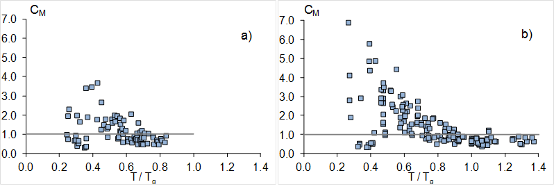 Figura 15 Cocientes del desplazamiento máximo inelástico y elástico de azotea, CM , obtenidos para los dos conjuntos de edificios: a) edificios de acero, y b) edificios de concreto reforzado.