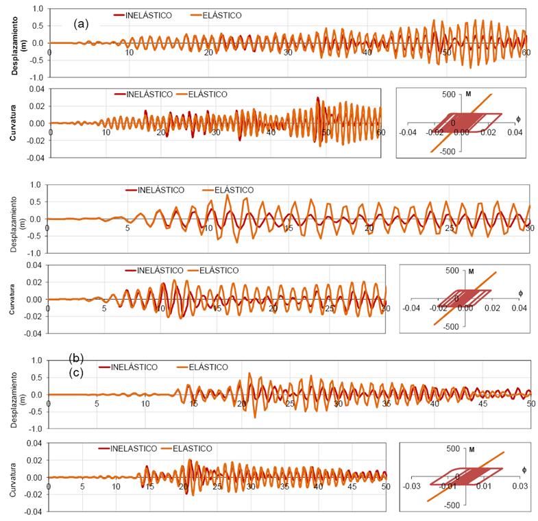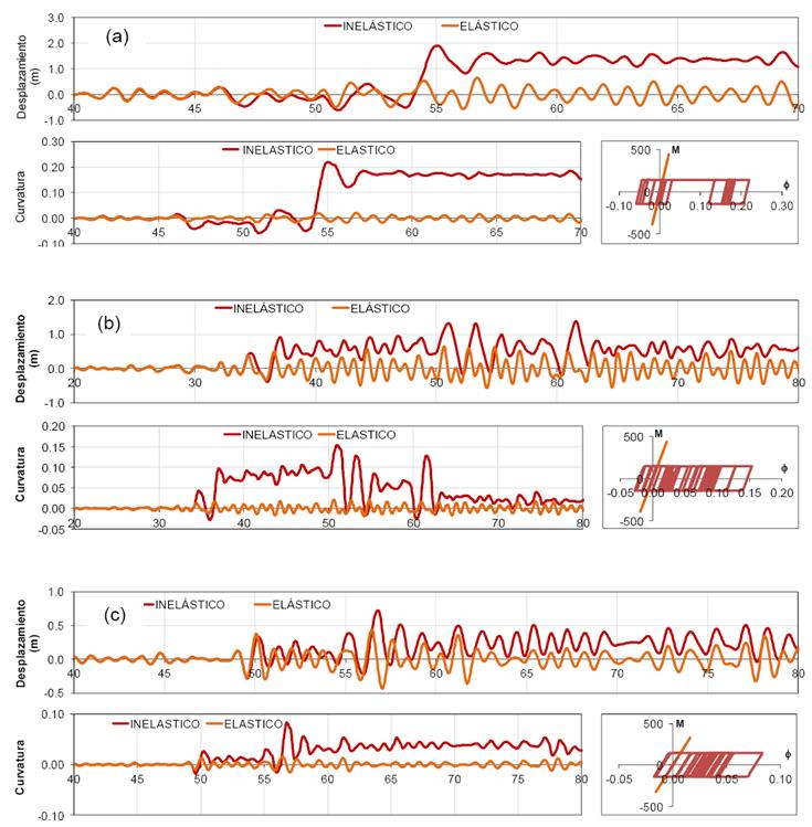 Figura 16 Historias de respuesta de desplazamientos (elástico e inelástico), curvatura y ciclo de histéresis: a) T/Tg = 0.37, b) T/Tg =0.51, c) T/Tg =0.59.