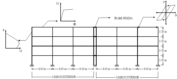Los edificios seleccionados se modelaron bidimensionalmente y analizaron con el programa de computadora RUAUMOKO (Carr, 2009). Dada la simetría en planta, se consideró un marco exterior y un marco interior del sentido longitudinal, por lo que sólo se consideró la mitad del peso total del edificio, el cual se distribuyó por áreas tributarias y se concentró en los nodos del marco equivalente. Para fines de modelado de los edificios de CR y acero, el marco externo y el marco interno se colocaron en serie y se unieron con una trabe de liga articuladas en los extremos y con área muy grande comparada con la del resto de las secciones, con la finalidad de que los desplazamientos laterales fueran iguales en cada marco. El sistema de piso se modeló como un diafragma rígido. Las columnas se supusieron empotradas. En la figura 3 se ilustra esquemáticamente la estrategia de modelado de un edificio de 4 niveles.