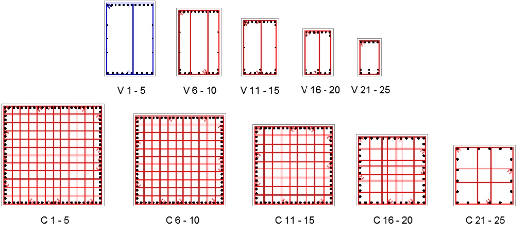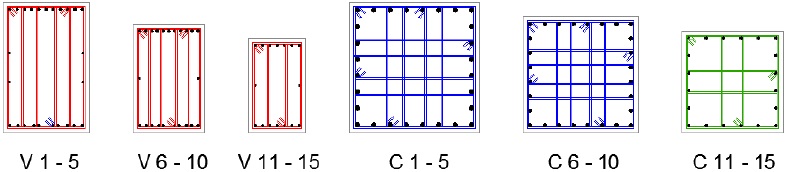 De manera esquemática, se aprecia que los estribos de las vigas, contenidas en las Figuras 8 a 13 (9, 10, 11, 12), se encuentren representados de color rojo para los estribos No. 2.5 usado para dichos elementos. Para demandas grandes de cortante en los modelos esbeltos, el color de los estribos en vigas está representado en color azul (estribos No. 3), como se aprecia en las Figuras 14 y 15. Además, con el procedimiento de diseño para marcos no dúctiles, en todas las columnas de todos los modelos se usaron estribos No. 2.5. La adición de los requisitos mínimos por confinamiento dúctil obligó a que la mayoría de las columnas utilizaran estribos del No. 3 (color azul), con diferencias en las columnas del último nivel de las Figuras 9, 13 y 15, donde se necesitan de estribos del No. 4 (color verde), para satisfacer la condición de cuantía mínima de refuerzo transversal indicada en el Ap. 7.3.4c, cuando se usa la separación mínima y el número máximo posible de ramas entre estribos.